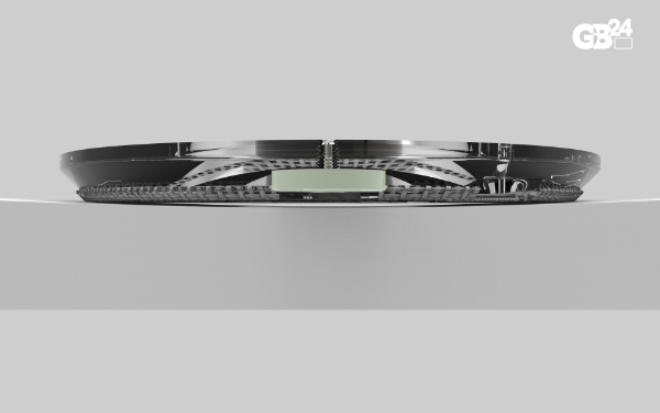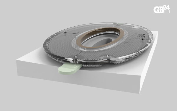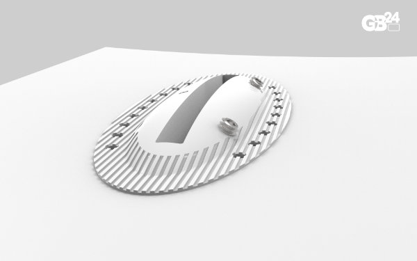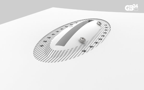 The jig features optional tape tabs that help attach it to a board during routing. Multiple tab positions facilitate the attachment process. A soft rubber pad on the bottom protects the board, while a beveled edge around the outer perimeter creates a narrower bottom and makes lifting easier. The layout guide, when inserted into the jig insert, helps position the jig on the shaper's marks using engraved layout lines.
