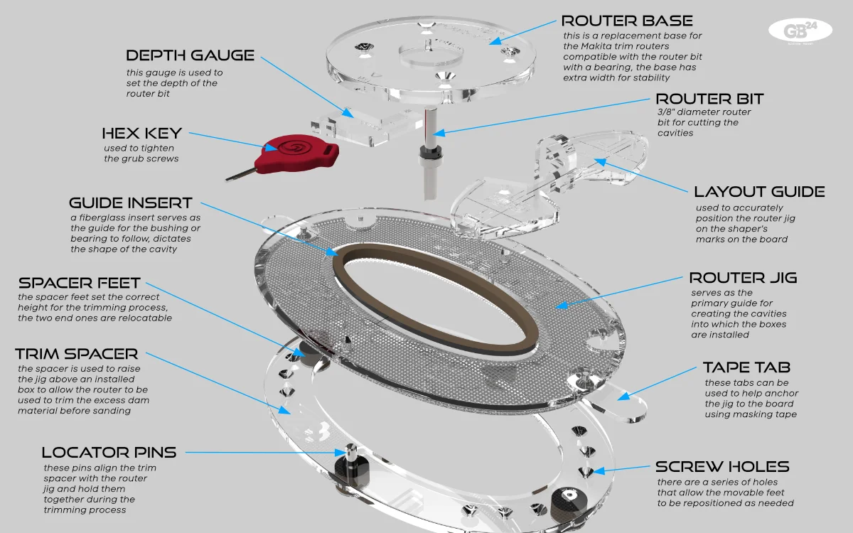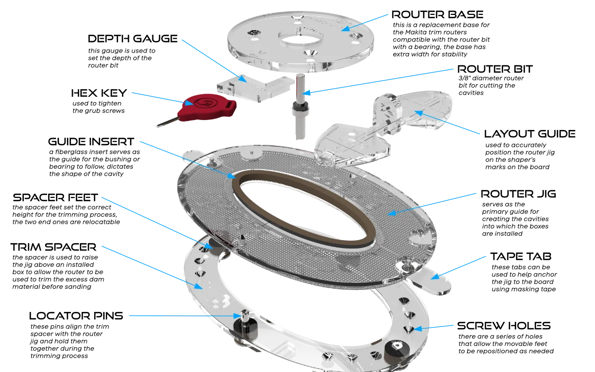 The illustration details each component of the routing system. The router jig is the central component—everything revolves around it. The jig's primary role is to guide the routing cavities where boxes are installed. A guide insert in the jig, made of phenolic material for strength and wear resistance, serves as the guide. This insert is removable for easy replacement and allows different inserts to be swapped in for future system parts (e.g., a canard box or leash plug).