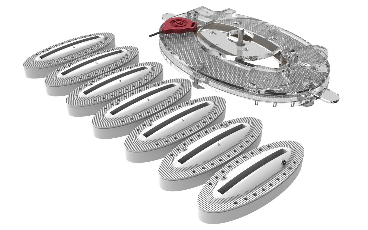 Each end of the spacer has seven holes into which the feet can be inserted. Each foot has a pin that fits in these holes.