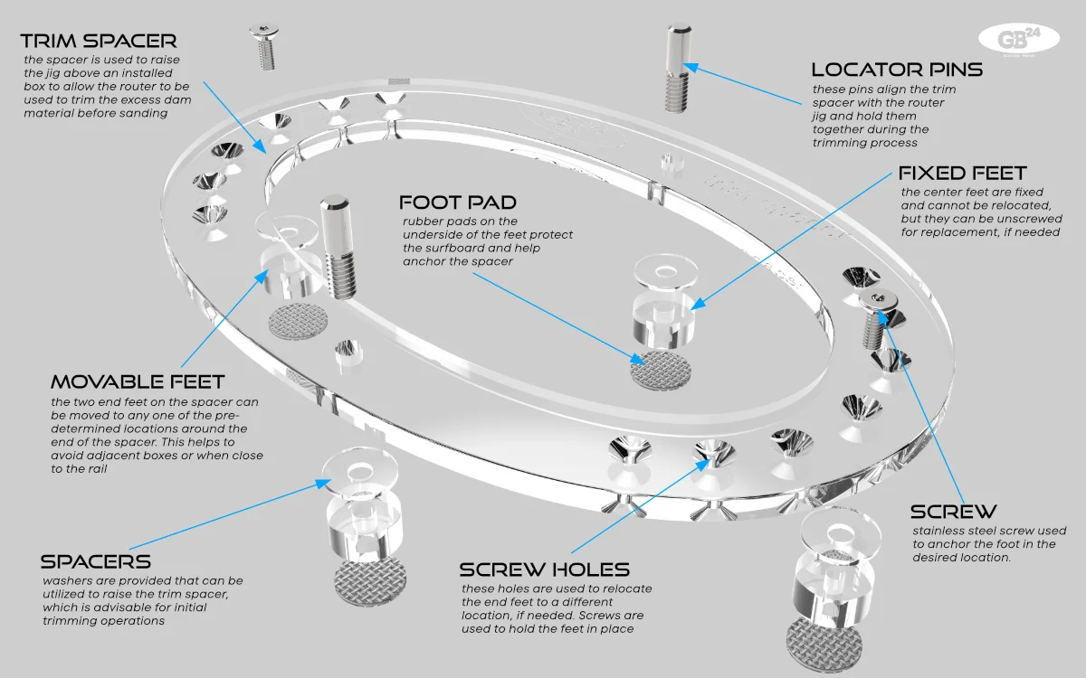 As part of our routing system, we provide a TRIM SPACER to remove the excess dam material before sanding the board. It is utilized after the board has been hot-coated and before sanding.